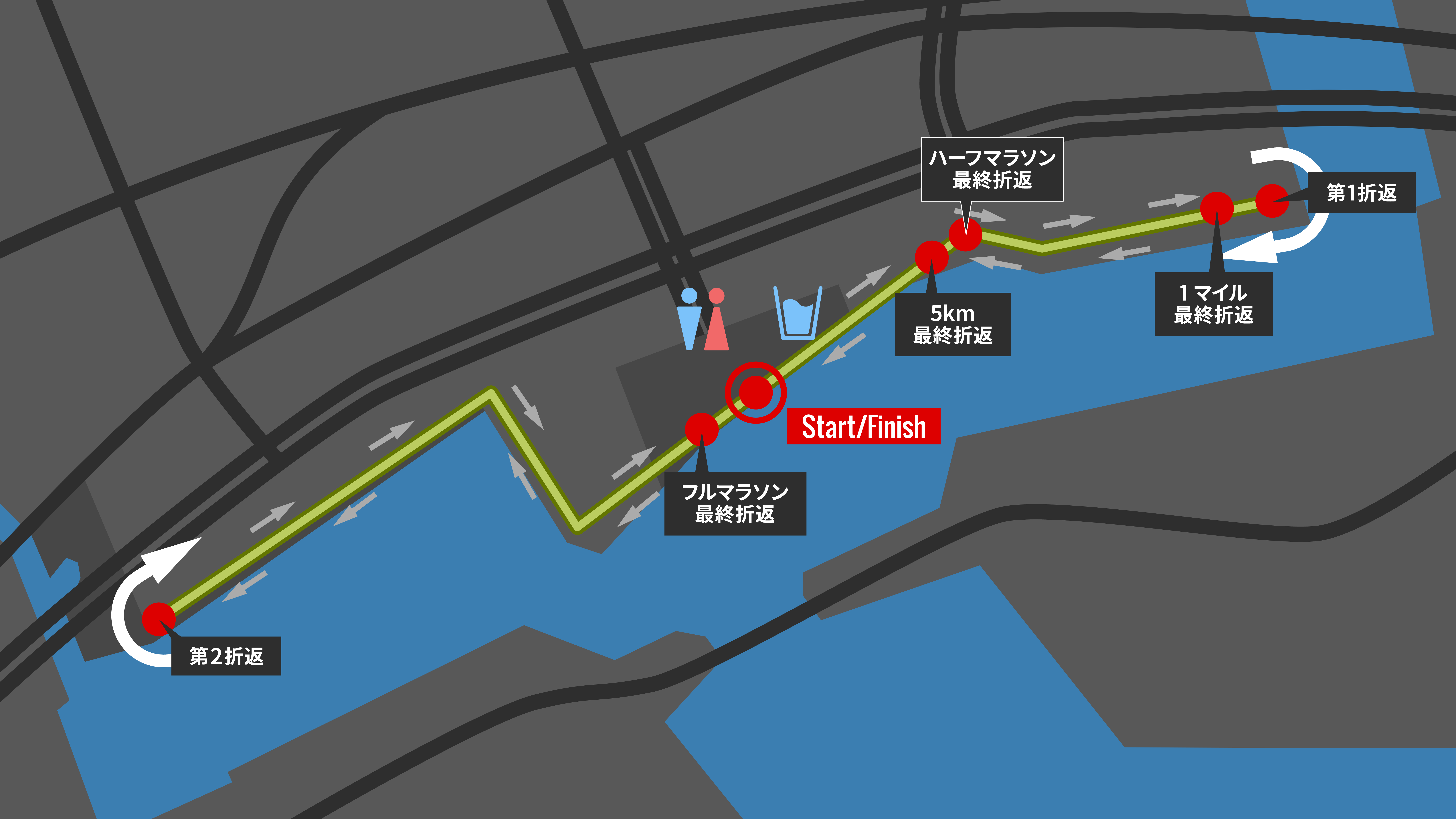 <ハーフマラソン>(START→第1折返→第2折返→FINISH)×5→ハーフマラソン最終折返→FINISH